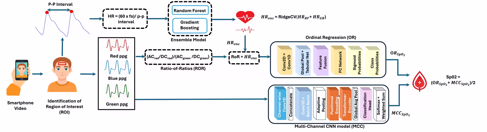 Presents a unified smartphone-video pipeline for contactless SpO₂ and HR estimation by combining physiology-aware Ratio-of-Ratios features with hybrid ensemble and CNN modeling.